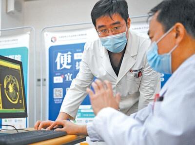 近年来,天津医科大学总医院已开通线上复诊、专病管家、数字胶片“云影像”等近20项线上服务。图为医生通过电脑调阅患者影像检查结果进行商讨。新华社记者 李 然摄